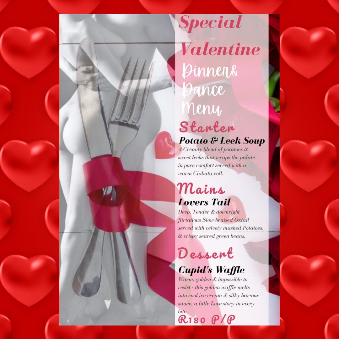 Join us Saturday 14 Feb for an evening of romance. Delicious food and dancing afterwards. Bookings essential.